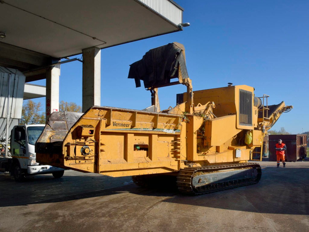 Con una pala meccanica viene caricato su un apposito trituratore semovibile, con motore diesel, che ne permette l’uso, anche fuori dell’impianto. La macchina tritura il verde con un tamburo provvisto di mazzuoli che gira a bassa velocità e che può triturare e sfibrare fino a 60 m3/h di materiale.